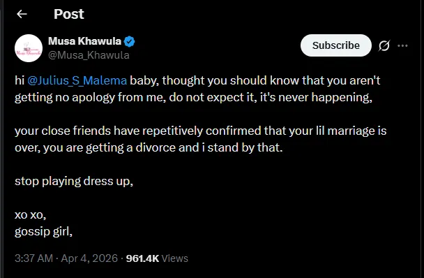 "Hi Julius_S_Malema baby, thought you’d know that you aren’t getting no apology from me… Your close friends have repeatedly confirmed that your lil marriage is over, you are getting a divorce and I stand by that. Stop playing dress up."