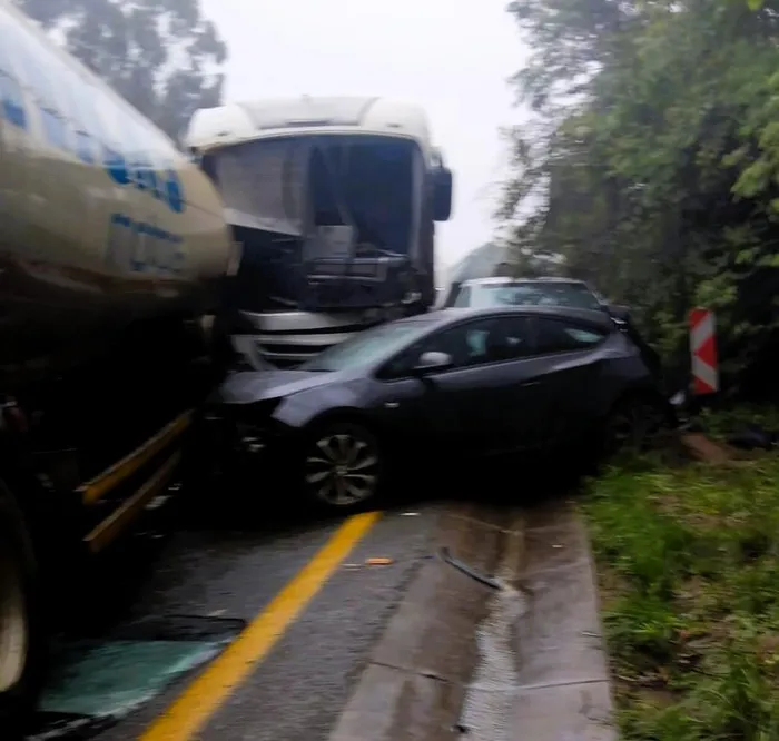 Traffic has come to a standstill on the N1 North at the Witvlag turn-off following a serious collision involving a tanker and a hatchback amid misty and rainy conditions.