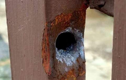 A bullet hole on the fence of a backyard in Westbury, where five people were shot, including Reece.