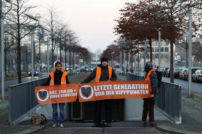 Activists of "Letzte Generation" (Last Generation) hold a banner at the entrance of the parking garage of Germany's lower house of parliament Bundestag to protest for a speed limit on highways as well as for affordable public transport, in Berlin, Germany. Picture: Christian Mang/ Reuters