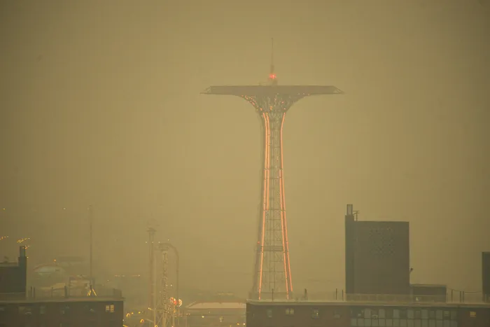 General view on June 07, 2023 of the hazy Coney Island skyline in New York during poor air quality due to windblown smoke from the Canadian wildfires. Authorities urge people to wear masks. Picture: Deccio Serrano/NurPhoto/Reuters