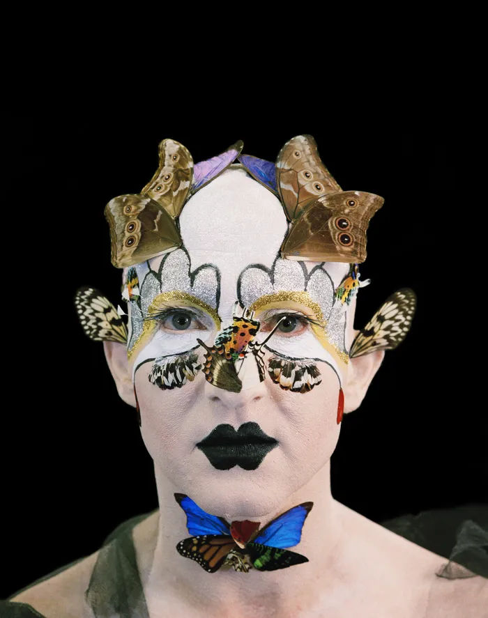 Against this, his face painting appears luminous, playful, almost whimsical in surface effect. This contrast is not decorative. It stages animism in a postmodern register. Beauty exists above the bloodied feet, not in denial of them. His face shape-shifts continuously. Elven, plant deva, fae, lepidopteran. A mythical creature that belongs neither fully to the human nor the symbolic. Identity loosens. The body appears to inhabit multiple realms simultaneously.