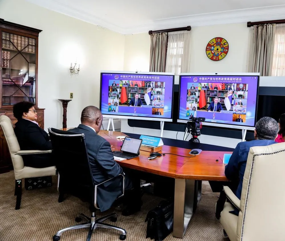 ANC President @CyrilRamaphosa is today addressing a High-Level meeting between the Communist Party of China (CPC) and other political parties from across the world, via video link. The President is joined in the meeting by SG Cde @MbalulaFikile and the DSG cde Nomvula Mokonyane pic.twitter.com/FEX65bVmXc