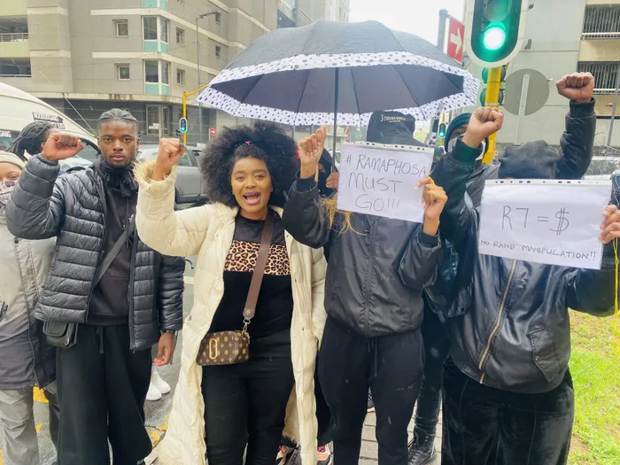 Chanting “Ramaphosa must fall,” the protesters held placards reading “Ramaphosa must go” during the peaceful demonstration.
