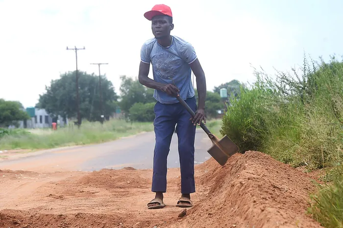 Maruping Chauke (25) says he makes at least R100 a day working on a patch of road that is riddled with potholes in Mogwase, outside Rustenburg.