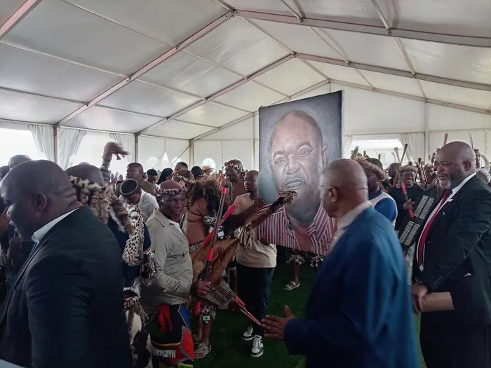 The late Inkosi Phathisizwe Luthuli's portrait is held aloft during his funeral service on Sunday.