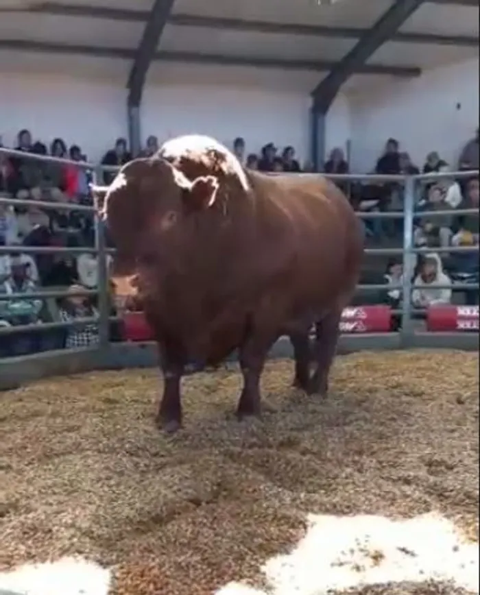 A video posted online by Thabo Dithakgwe shows the densely muscular bull prancing about the hay inside a cage while the auctioneer rattles away on the mic.