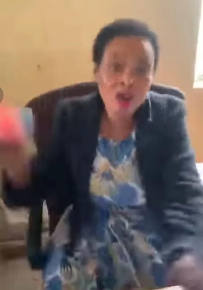 A woman seated behind a desk raises her hand with an object in it. A Sassa official from the Dundee office in KZN was caught on camera arguing with social grant clients. Picture: Screenshot of video
