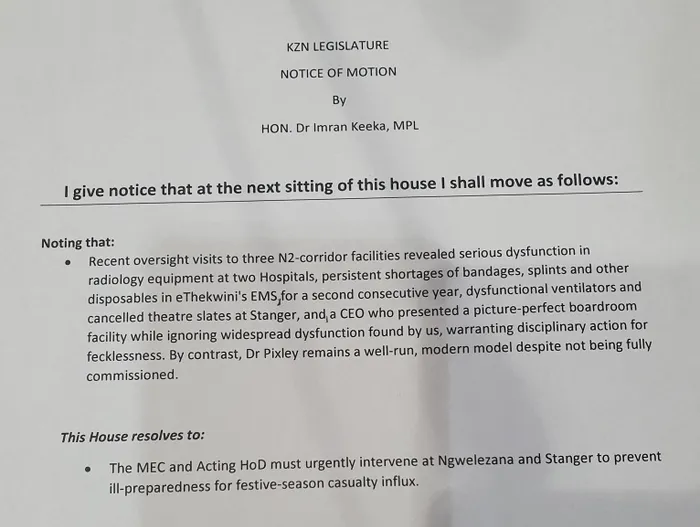 An image of Dr Imran Keeka's Notice of Motion delivered in the KZN Legislature.