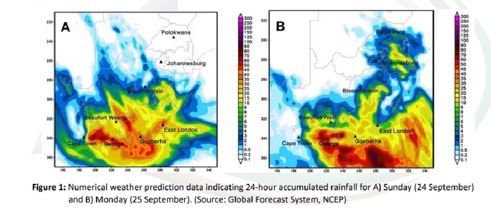 “On Monday the cut-off low pressure system will move to the southern coast, developing a so-called scorpions tail, which will bring about further widespread and heavy rainfall over the southern parts of the Western Cape and southern parts of the Eastern Cape,” Saws said.