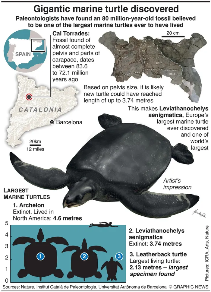 November 17, 2022 – Palaeontologists have found an 80-million-year-old fossil believed to be one of the largest marine turtles ever to have lived. Graphic shows details about the relevance of the discovery.