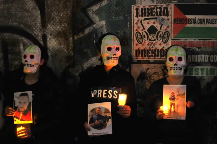 Pro-Palestine demonstrators wearing skull masks hold candles and pictures of journalists killed during the Israel-Hamas conflict during a vigil in Mexico City.