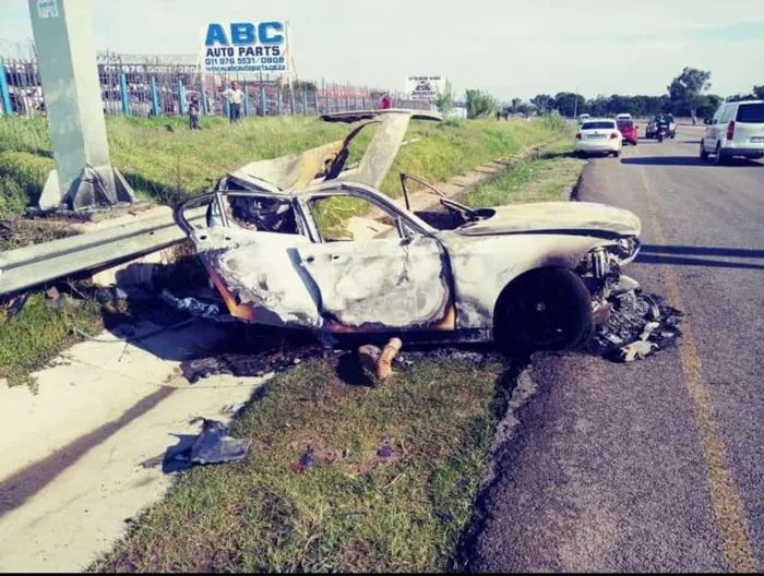 It is believed that Motjeka Madisha’s BMW 1 Series crashed into the pole of a billboard and burst into flames. Picture: Supplied