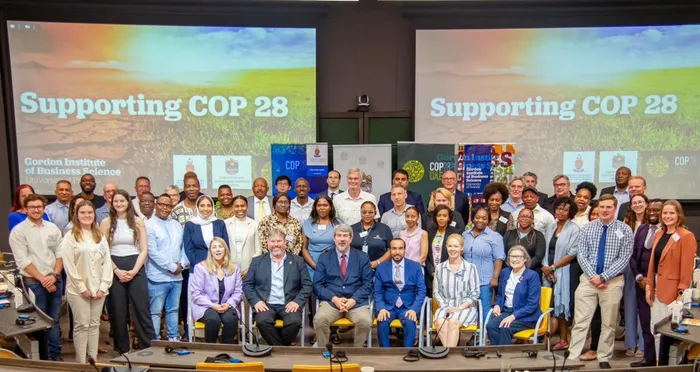 The panellists surrounded by some of the attendees at the recent COP28 Stocktake hosted by the Embassy of the United Arab Emirates and the University of Pretoria. Picture: Supplied