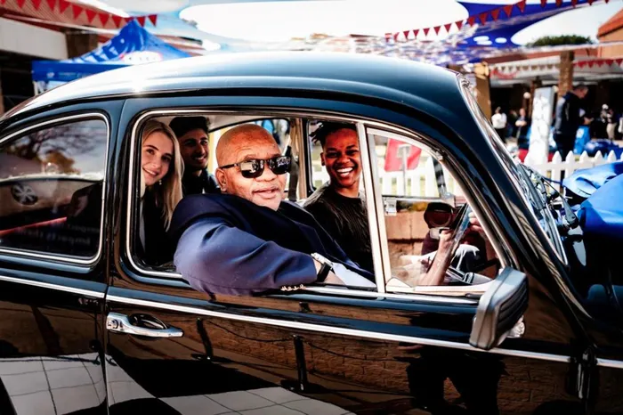 Interim Vice-Chancellor of UP Professor Themba Mosia, with some of the students take a ride in the classic 1967 Beetle. Supplied