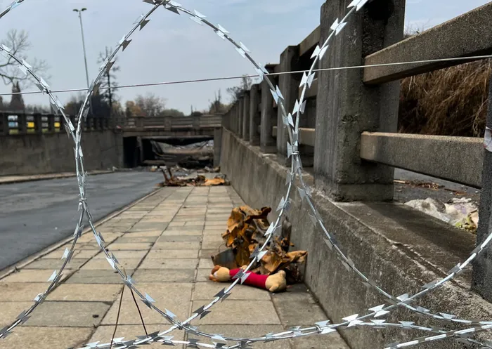 A child’s stuffed toy lies abandoned on the other side of the barbed wire barrier in front of the ruins of the underpass that was destroyed when a truck carrying liquid petroleum gas exploded on Christmas Eve. Picture: KEVIN RITCHIE