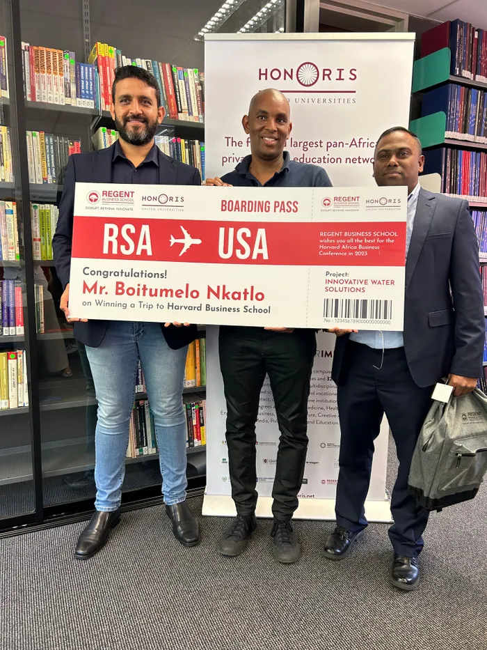 Johannesburg - Honoris United Universities and Regent Business School are proud to announce that one of their students, Boitumelo Nkatlo, has returned from a trip to Harvard Business School which he won after the entrepreneurship skills he demonstrated in his ground-breaking project, BNAqua Solutions.