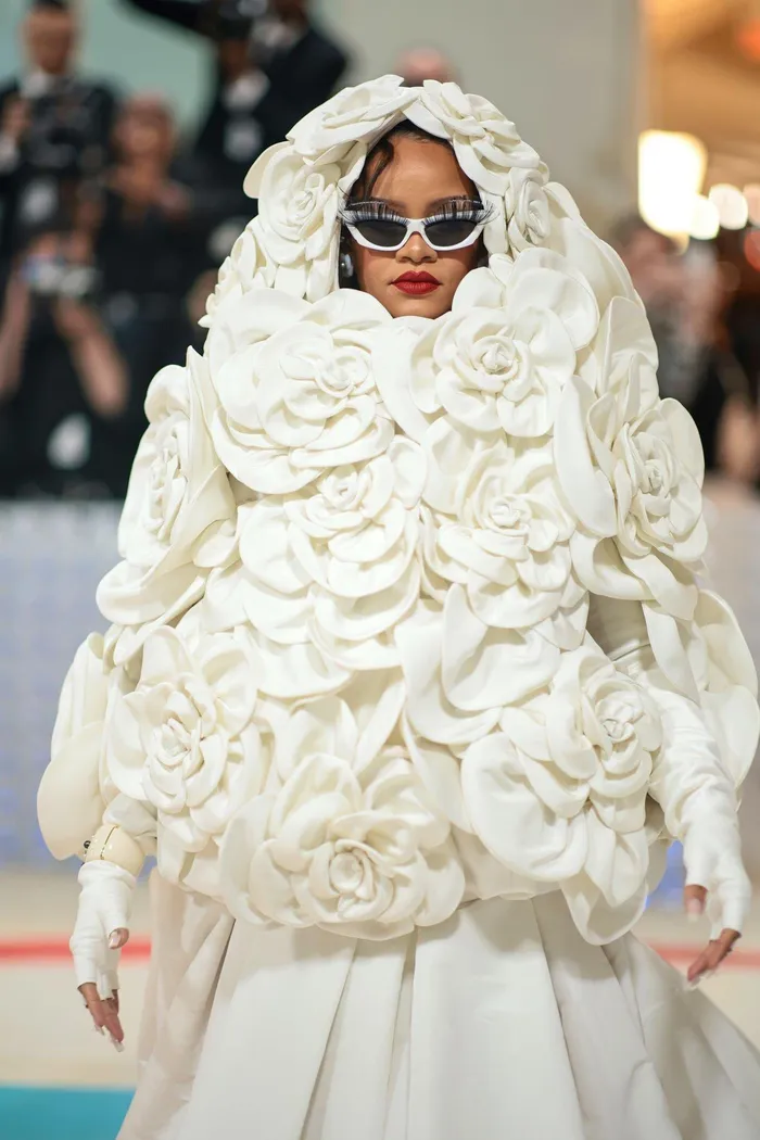 Rihanna made a fashionably late entrance in floral masterpiece, a custom Maison Valentino look that featured a five-metre train and 30 camelias made of 500 petals.