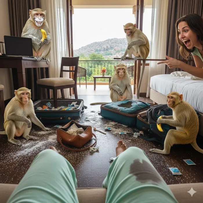 Before absconding with her apples and bananas, the bonnet macaques dumped sugar packets from the coffee station all over the floor and suitcases. One chucked Palmer’s retainer across the room. Another emptied its bladder.