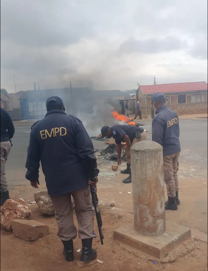 Ekurhuleni Metropolitan Police Department monitor Tembisa streets as residents protest electricity disconnections affecting registered indigent households.