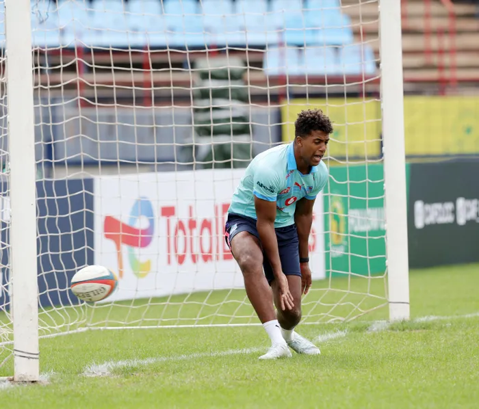 Bulls wing Canan Moodie fools around at training in front of a football goal ahead of their URC derby against the Stormers.
