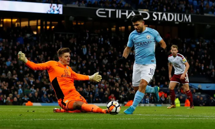 Sergio Aguero scores the second goal for Manchester City as Burnley goalkeeper Nick Pope attempts to save. Photo: Phil Noble/Reuters Sergio Aguero scores the second goal for Manchester City as Burnley goalkeeper Nick Pope attempts to save. Photo: Phil Noble/Reuters
