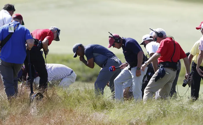 Tiger Woods along with officials and media members look for a ball on the sixth hole during the first round of the 118th US Open Championship at Shinnecock Hills. Photo: Justin Lane/EPA Tiger Woods along with officials and media members look for a ball on the sixth hole during the first round of the 118th US Open Championship at Shinnecock Hills. Photo: Justin Lane/EPA