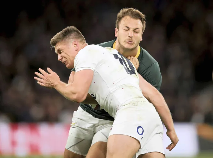 Owen Farrell flies into André Esterhuizen at Twickenham. Photo: Adam Davy/PA Wire via AP Owen Farrell flies into André Esterhuizen at Twickenham. Photo: Adam Davy/PA Wire via AP