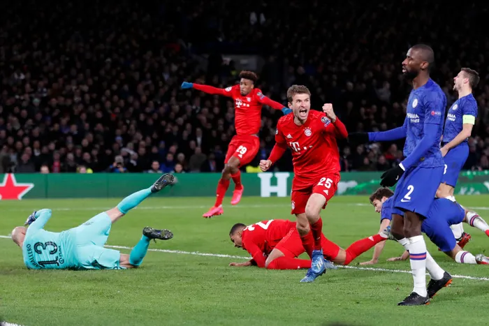 Bayern's Serge Gnabry, bottom, celebrates with his teammate after scoring the opening goal of his team during the Champions League round of 16 soccer match between Chelsea and Bayern Munich on Tuesday. Photo: AP Photo/Frank Augstein Bayern's Serge Gnabry, bottom, celebrates with his teammate after scoring the opening goal of his team during the Champions League round of 16 soccer match between Chelsea and Bayern Munich on Tuesday. Photo: AP Photo/Frank Augstein