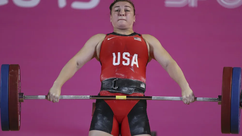 Katherine Nye of the United States competes in women's snatch 76 kg weightlifting at the Pan American Games in Lima, Peru last year. Picture: Fernando Llano/AP