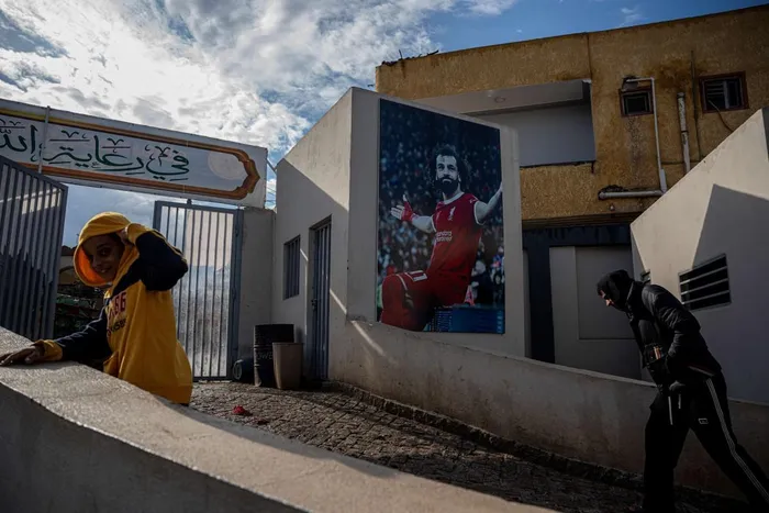 Egyptians walk past a picture of Liverpool's footballer Mohamed Salah at his Youth Centre in the Egyptian village of Nagrig, about 120 kilometres northwest of Cairo, on December 10, 2025.