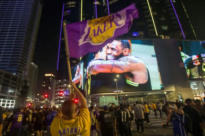 Lakers fans celebrate their team winning the 2020 NBA Championship in Los Angeles. Photo: Ringo Chiu/Reuters