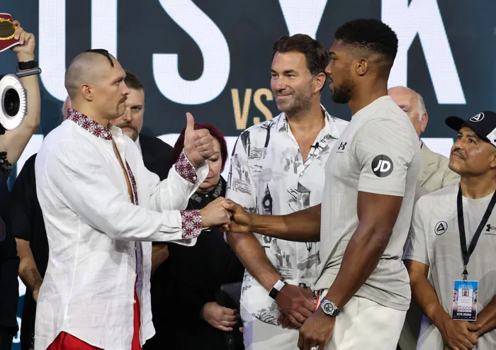 Ukraine's Oleksandr Usyk (L) and Britain's Anthony Joshua (R) greet each other during a public weighing ahead of their heavyweight boxing rematch for the WBA, WBO, IBO and IBF titles in the Saudi Red Sea city of Jeddah, on Friday. The match, billed as the ‘Rage on the Red Sea’, is set to take place at the Jeddah Super Dome on Saturday Ukraine's Oleksandr Usyk (L) and Britain's Anthony Joshua (R) greet each other during a public weighing ahead of their heavyweight boxing rematch for the WBA, WBO, IBO and IBF titles in the Saudi Red Sea city of Jeddah, on Friday. The match, billed as the ‘Rage on the Red Sea’, is set to take place at the Jeddah Super Dome on Saturday. Photo: Giuseppe Cacace/AFP