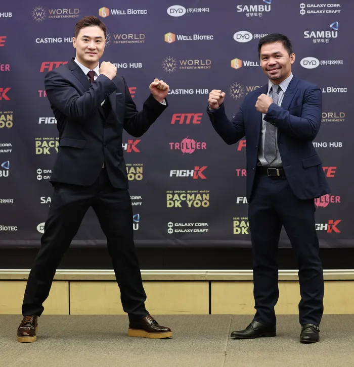 Former Filipino boxing star Manny Pacquiao (R) and South Korean mixed martial artist DK Yoo (L) pose for a photo during a news conference. Pacquiao will take on Yoo in an exhibition match in South Korea this winter to raise money for war-torn Ukraine. Photo: EPA
