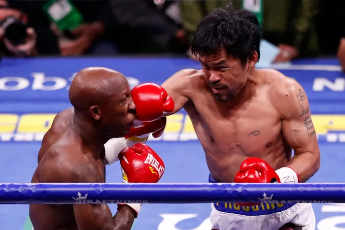 two professional boxers during a fight Manny Pacquiao (righy) of the Philippines in action against Yordenis Ugas of Cuba during their 12 round WBA World Welterweight Championship fight at the T-Mobile Arena in Las Vegas, Nevada, USA, 21 August 2021. Picture: Etienne Laurent/EPA
