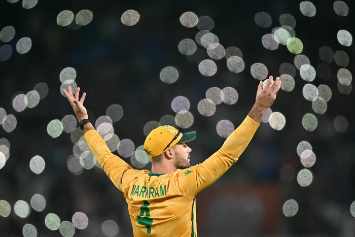 South Africa's captain Aiden Markram gestures during the 2026 ICC Men's T20 Cricket World Cup semi-final match between New Zealand and South Africa at the Eden Gardens in Kolkata on March 4, 2026. Picture: Dibyangshu SARKAR / AFP