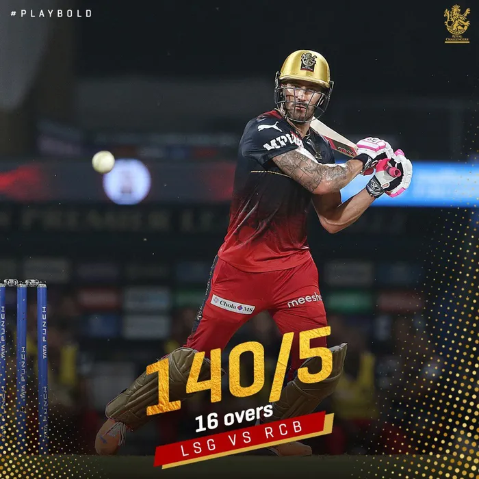 Royal Challengers Bangalore captain Faf du Plessis scored a brilliant 96 as he guided his team to an 18-run win over Lucknow Super Giants on Tuesday Royal Challengers Bangalore captain Faf du Plessis scored a brilliant 96 as he guided his team to an 18-run win over Lucknow Super Giants on Tuesday. Photo: @RCBTweets/Twitter