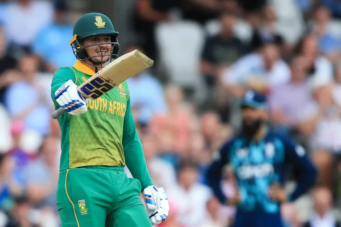 South Africa's Quinton de Kock celebrates his half-century on the third one-day international cricket match against England at Headingley Cricket Ground in Leeds on Sunday South Africa's Quinton de Kock celebrates his half-century on the third one-day international cricket match against England at Headingley Cricket Ground in Leeds on Sunday. Photo: Lindsey Parnaby/AFP
