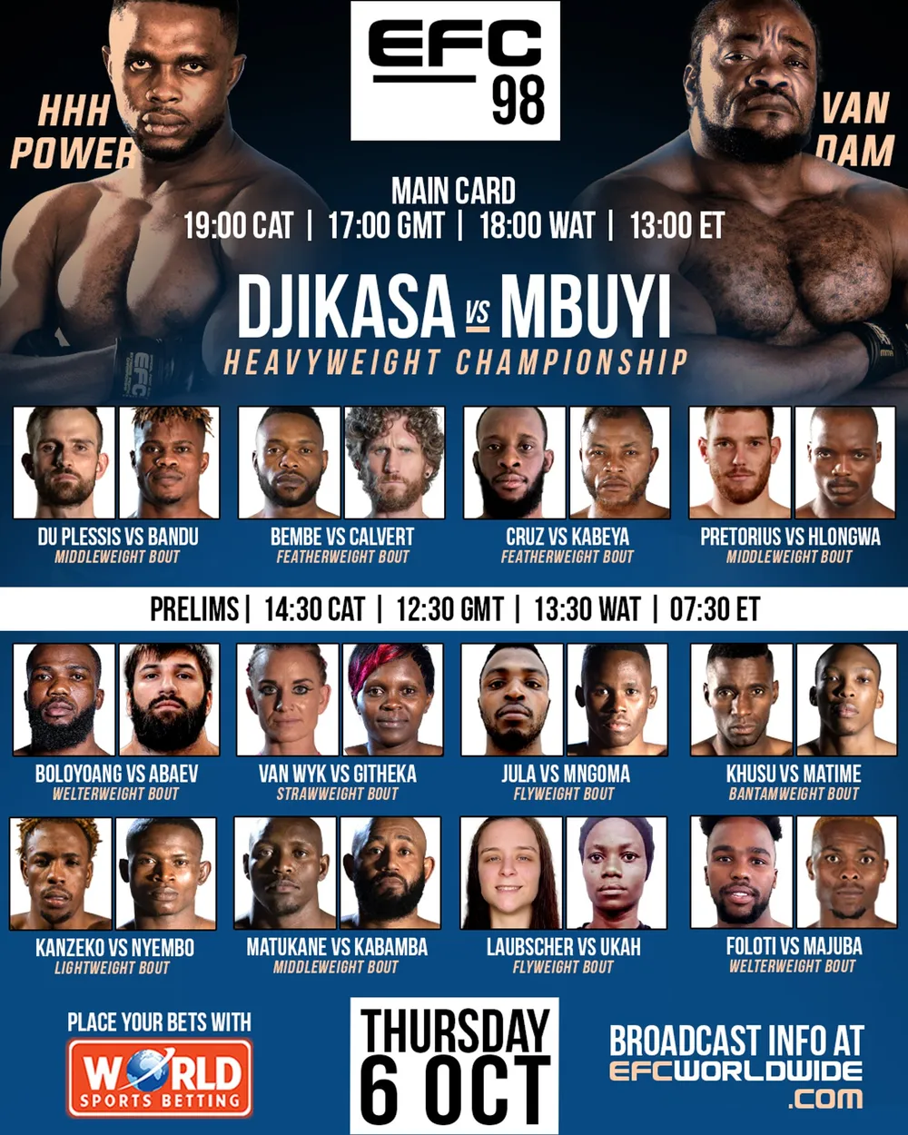 Laubscher and Ukah will be on the prelim card of EFC98 headlined by the Heavyweight title fight between Matunga “HHH Power” Djikasa and fellow Congolese compatriot Vandam Mbuyi.