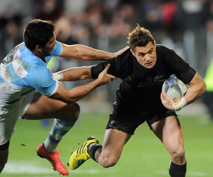 New Zealand All Blacks flyhalf Dan Carter, right, is tackled by Argentina's Jeronimo De la Fuente during a Test match in Christchurch. World Cup-winning All Blacks flyhalf Dan Carter has made a surprise return to Super Rugby in New Zealand at the age of 38. Picture: Ross Setford/SNPA via AP New Zealand All Blacks flyhalf Dan Carter, right, is tackled by Argentina's Jeronimo De la Fuente during a Test match in Christchurch. World Cup-winning All Blacks flyhalf Dan Carter has made a surprise return to Super Rugby in New Zealand at the age of 38. Picture: Ross Setford/SNPA via AP