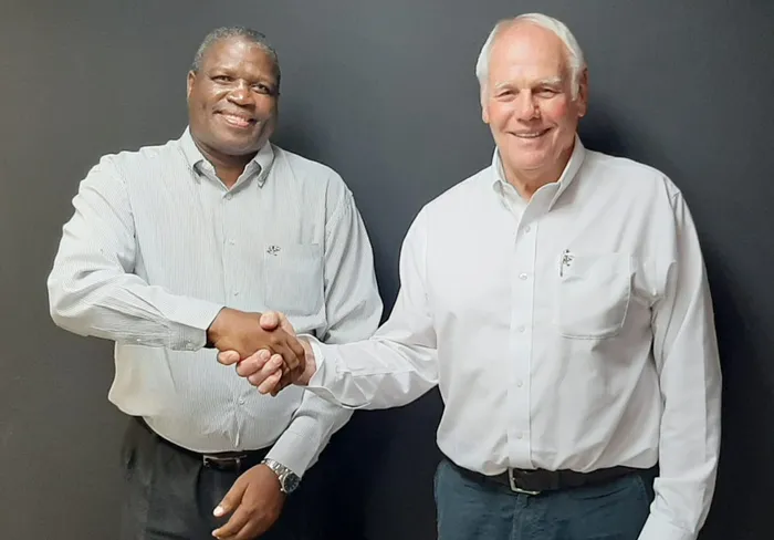 KwaZulu-Natal Rugby Union deputy president Lulu Bodla, left, congratulates Brian van Zyl on his election to the presidency of the union.