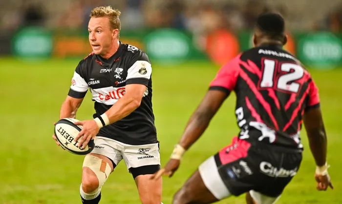 Fred Zeilinga of the Cell C Sharks with the ball Fred Zeilinga of the Cell C Sharks and Wian van Niekerk of Airlink Pumas during the 2023 Currie Cup match at Kings Park in Durban on 07 April 2023. Picture: Gerhard Duraan/BackpagePix