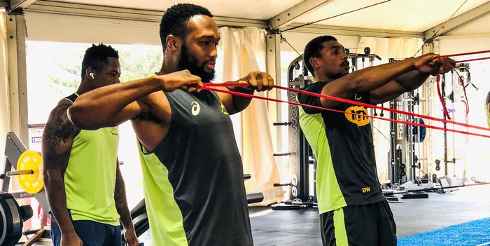 Damian Willemse, right, in the gym at the Springboks’ base in Australia alongside Lukhanyo Am. Picture: Springboks/twitter