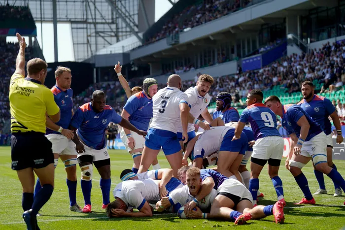 Italy's number eight Lorenzo Cannone crosses the line to score Italy's first try during their Rugby World Cup Pool A match against Namibia at Stade Geoffroy-Guichard in Saint-Etienne on Saturday Italy's number eight Lorenzo Cannone crosses the line to score Italy's first try during their Rugby World Cup Pool A match against Namibia at Stade Geoffroy-Guichard in Saint-Etienne on Saturday. Photo: Francis Bompard/AFP