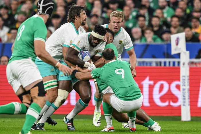 South Africa's Siya Kolisi is tackled by Ireland's Jamison Gibson-Park as Eben Etzebeth looks on during their Rugby World Cup Pool B match South Africa's Siya Kolisi is tackled by Ireland's Jamison Gibson-Park as Eben Etzebeth looks on during their Rugby World Cup Pool B match at the Stade de France in Saint-Denis on Saturday. Photo: Martin Bureau/AFP