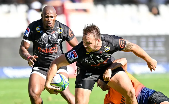 Andre Esterhuizen while he was still playing for the Sharks with the support of Makazole Mapimpi during the 2020 Super Rugby match between Sharks and Jaguares at the Jonsson Kings Park,Durban on 7 March 2020. Picture: Gerhard Duraan/BackpagePix