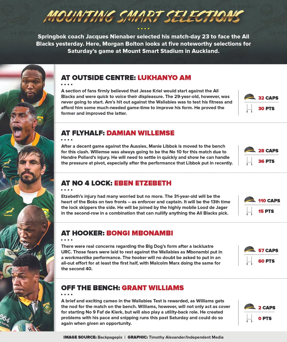 Smith forms a new-look loose trio with Franco Mostert and Jasper Wiese, and they have big boots to fill after Duane Vermeulen, Marco van Staden, and Pieter-Steph du Toit dominated the Wallabies in the first test.