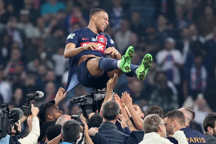 Paris Saint-Germain's French forward #07 Kylian Mbappe (C) is thrown in the air after his team won the French Cup Final football match between Olympique Lyonnais (OL) and Paris Saint-Germain (PSG) at the Stade Pierre-Mauroy, in Villeneuve-d'Ascq, northern France Kylian Mbappe's contract is now up at Paris Saint-Germain and he recently confirmed he would leave at the season's end, with Real Madrid expected to be his next destination. Picture: Denis Charlet/AFP