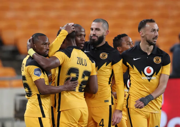 Lebogang Manyama of Kaizer Chiefs (c) celebrates goal, third goal hattrick during the DStv Premiership 2020/21 football match between Kaizer Chiefs and Golden Arrows at Soccer City, Johannesburg on 02 June 2021 ©Gavin Barker/BackpagePix