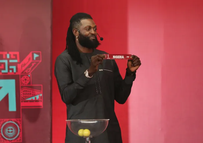 Emmanuel Adebayor draws Nigeria during the 2022 Fifa World Cup Draw for the African playoffs. Picture: Gavin Barker/BackpagePix